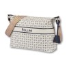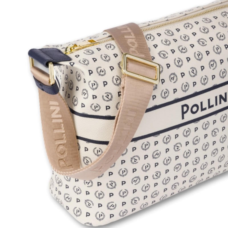 Borsa a spalla realizzata per l'esclusiva capsule collection Heritage Marina, ispirata alle atmosfere estive marine.L’Heritage Pvc assume un nuovo colore dato dalla combinazione dell’avorio con pattern blu mare. La borsa si caratterizza per il logo Pollini lettering posto sul quadrante frontale. Tracolla in nylon jacquard logato per doppia portabilità: a spalla e bandoliera.