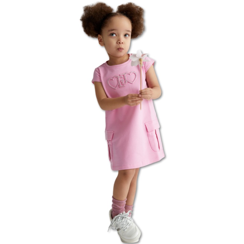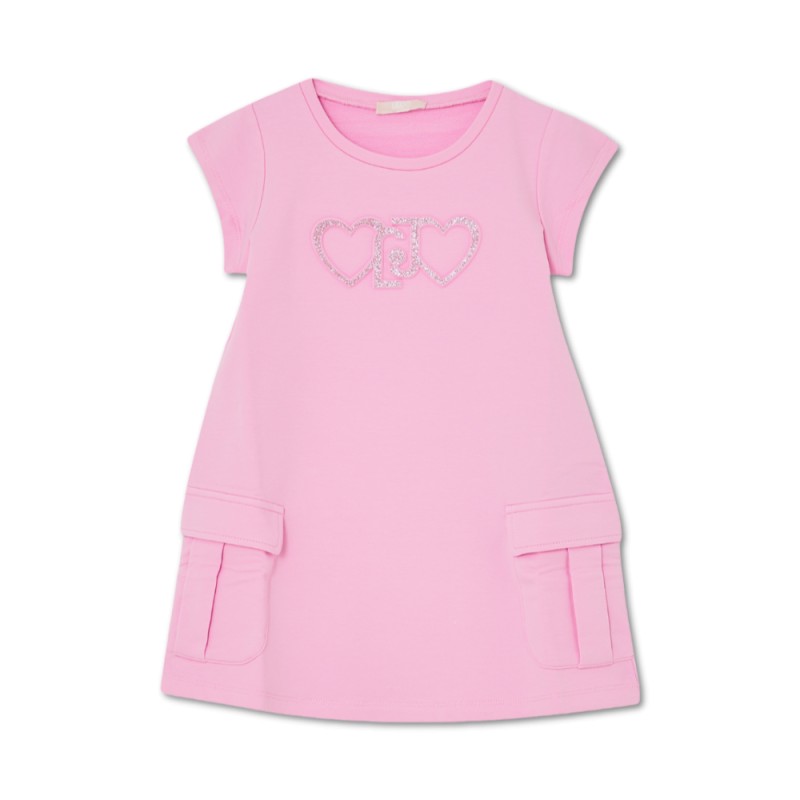 Abito in cotone stretch, cuori e lettering LJ lurex sul davanti, taglio girocollo, maniche corte, tasche con patta sui lati