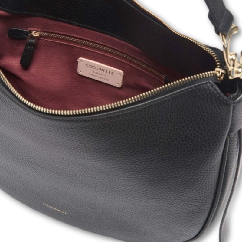 Silhouette essenziale per questa linea Coccinelle C-Easy dalle forme morbide e versatili. La particolare insellatura dona grazia e raffinatezza e conferisce un'attitudine unica. Non manca un elemento metallico che ritroviamo nel manico con il nuovo logo C-Me, che illumina questa borsa dall’anima estremamente versatile. Questo modello è realizzato in pelle lavorata tramite specifici macchinari e poi bottalata al fine di mantenerne la morbidezza. È una pelle molto resistente che si presta a una facile pulizia, ideale per un uso quotidiano.