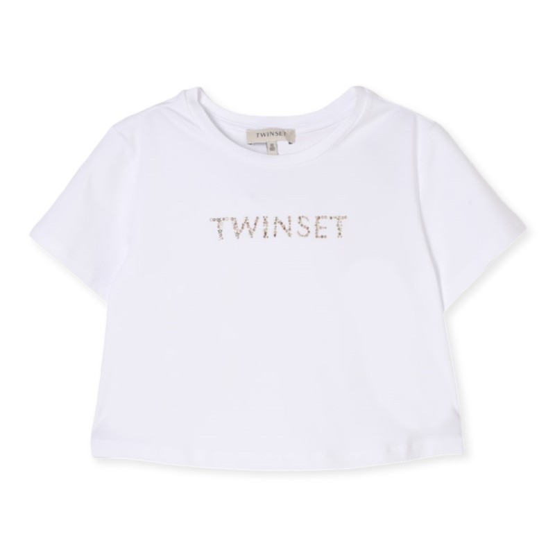 T-shirt Twinset cropped in cotone strech, maxi logo con borchie e strass sul davanti, girocollo, maniche corte.