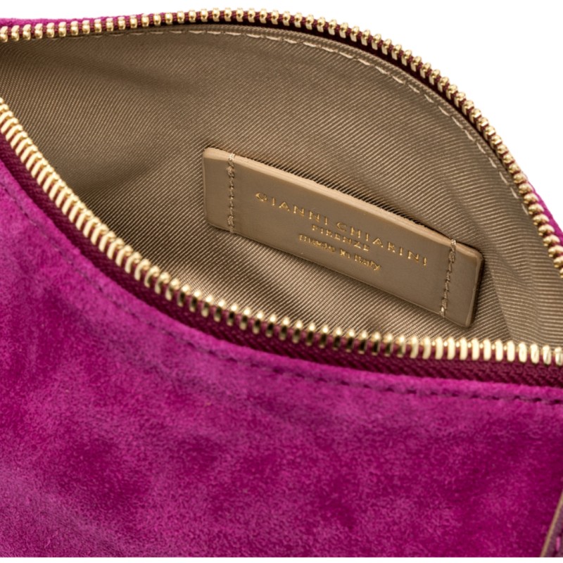 La borsa Nora Pouch by Gianni Chiarini Firenze è realizzata in morbida pelle scamosciata. È dotata di un cinturino in pelle che permette di portarla al polso e di una tracolla regolabile, entrambi removibili. Presenta una chiusura con zip per una maggiore praticità