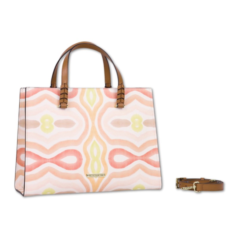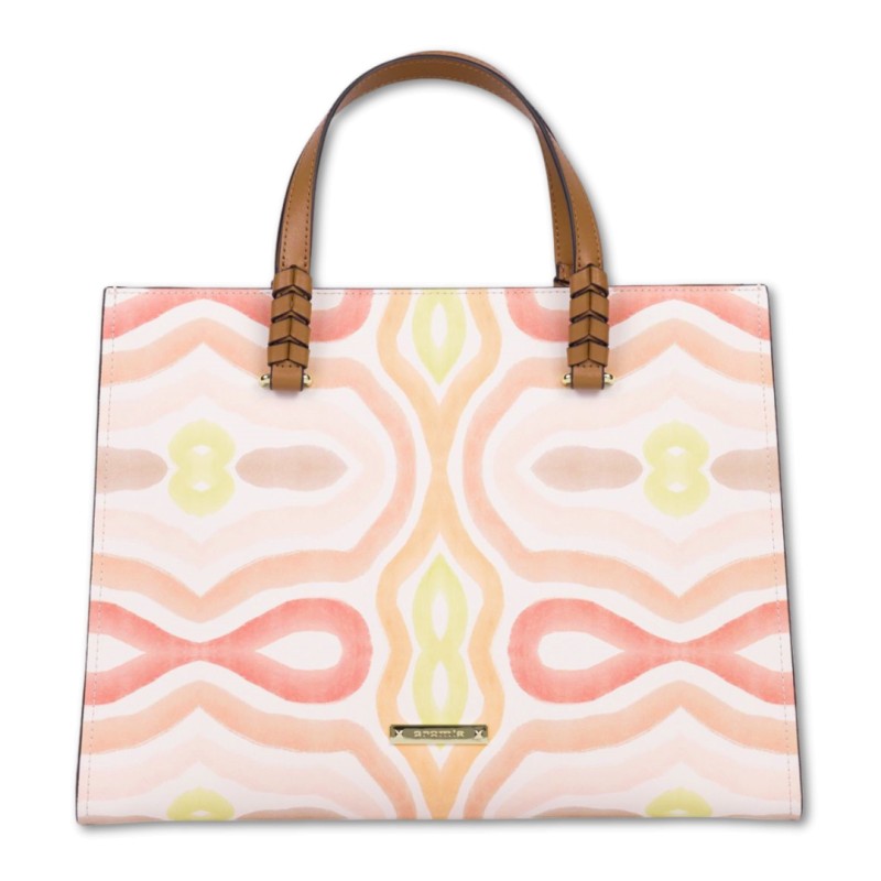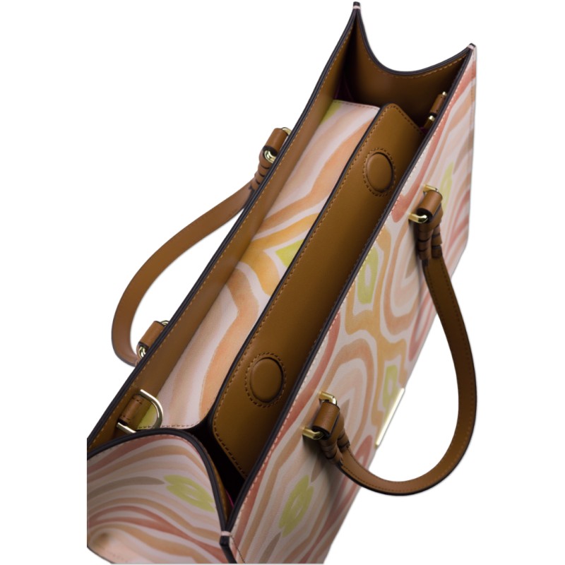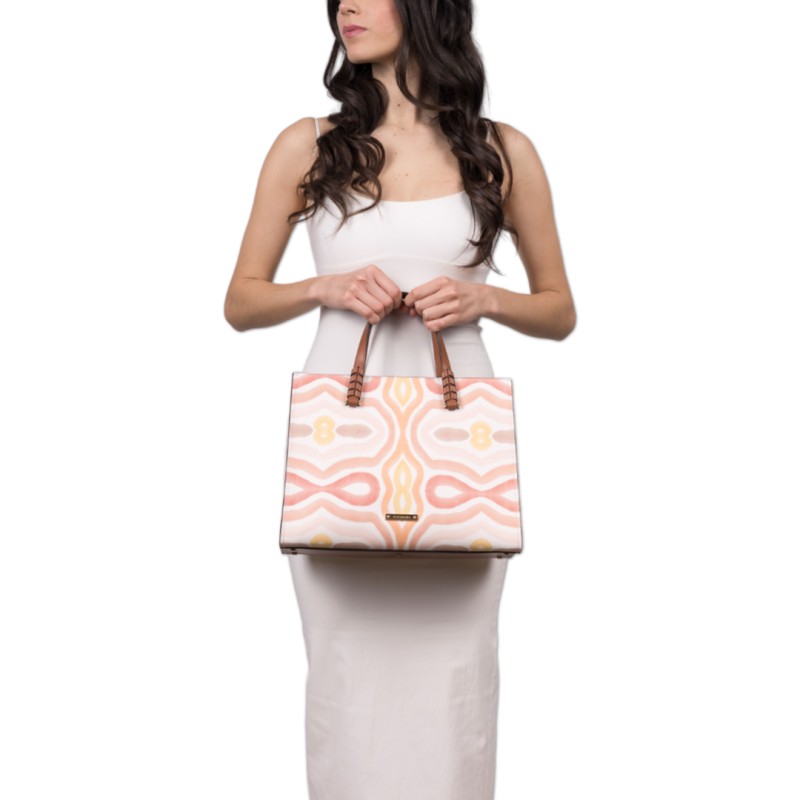 Tote, realizzata in vitello liscio con stampa batik ,manici in pelle con intreccio, dotata di tracolla per l’indosso cross over, accessori oro chiaro.