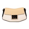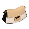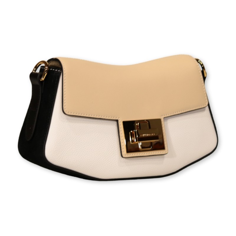 Borsa a mano con patta , in un fantastico mix di materiali, camoscio, vitello liscio e stampa cervo, girello Cromia in oro chiaro.