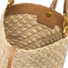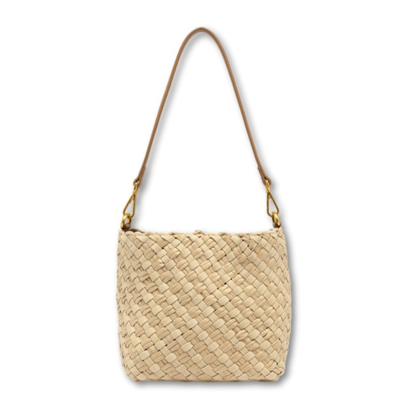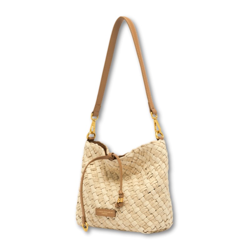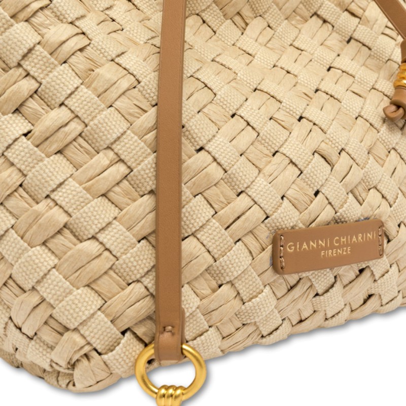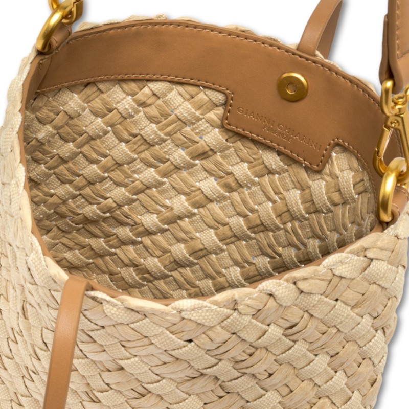 Mercy è la borsa a secchiello di Gianni Chiarini Firenze, realizzata in canvas e paglia intrecciati a mano, con una texture naturale e materica dal look artigianale