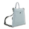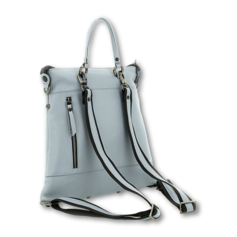 Grazie alla doppia tracolla può essere indossata a bandoliera oppure trasformata in zaino con un semplice movimento. È presente anche un piccolo manico corto che, spostato negli anelli laterali, diventa un manico più lungo perfetto per portarla comodamente a spalla. I bottoni inferiori e laterali permettono di modellarla in diverse forme, trasformandola in una shopping capiente o in un bauletto strutturato a seconda delle esigenze.